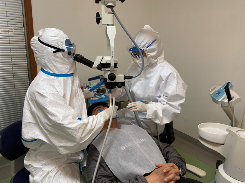 牙体牙髓病科的临床操作操作精细,疫情期间,穿着厚厚的防护服、配戴护目镜及防护面屏等,常常护目镜起雾,呼吸不顺畅,给临床操作造成很大困难,特别对于疑难病例,需要在牙科显微镜下进行操作,对医护人员的要求就更高,他们通常是坐到椅位上连续埋头工作几个小时……尽管呼吸不畅,尽管汗湿透了衣背,大家都毫无抱怨,逆行而上。3月9日起,随着疫情防控形势持续平稳向好,部分常规诊疗逐步恢复,前来就诊的患者也开始激增,从原来的日均处理患者20人次,增长到日均接诊患者60人次,到3月29日累计接诊患者1380余人次。