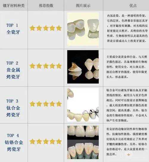 很多患者都有这样的感觉,假牙种类繁多,价格相差甚远,而医生总是推荐贵的,弄得自己也不知道该选哪种。其实,患者应该根据实际情况来选择,比如老年人,可以经济一点,装个便宜的,而年轻人,如果有经济实力,可以装一个中高档次的。比如,有患者可以不需要贵金属材料的,那么除了黄金外,还有种钴铬金属烤瓷牙,这种烤瓷牙的价位比较适中,且生物相容性大大提高,减少了牙龈变色情况的出现,是一种较为经济而实用的烤瓷牙。