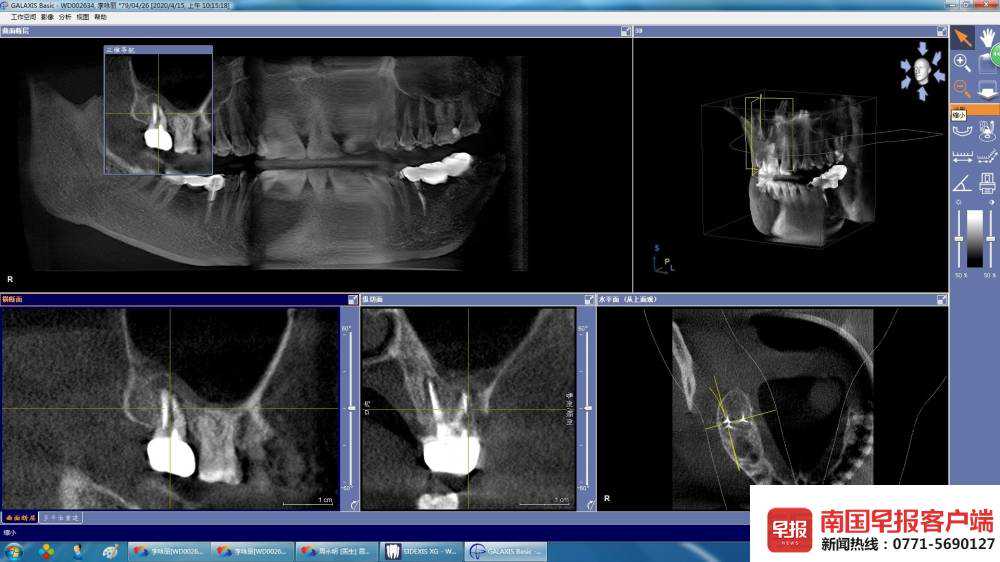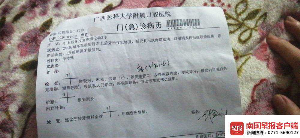 4月20日,广西医科大学附属口腔医院牙体牙髓科诊断为“慢性根尖周炎、慢性牙周炎”,治疗计划为方案一:根尖手术;方案二:拆除冠部修复后行根管再治疗。“后续治疗非常麻烦,不但要手术,还要植骨,况且费用也很高。”