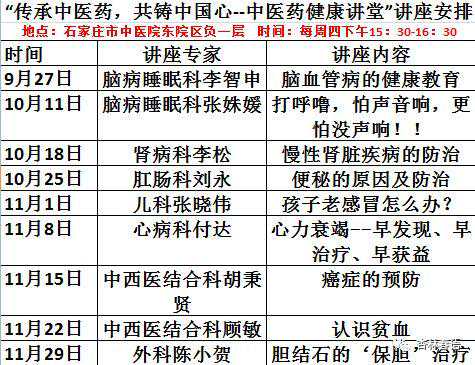 石家庄市中医院东院区“传承中医药,共铸中国心--中医药健康讲堂”系列活动每期将邀请50名现场观众参加,凡参加者现场均有精美礼品相送,现接受观众报名,请发送“姓名+电话+参加日期”到“杏林春语”微信公共号,我们期待您的光临~