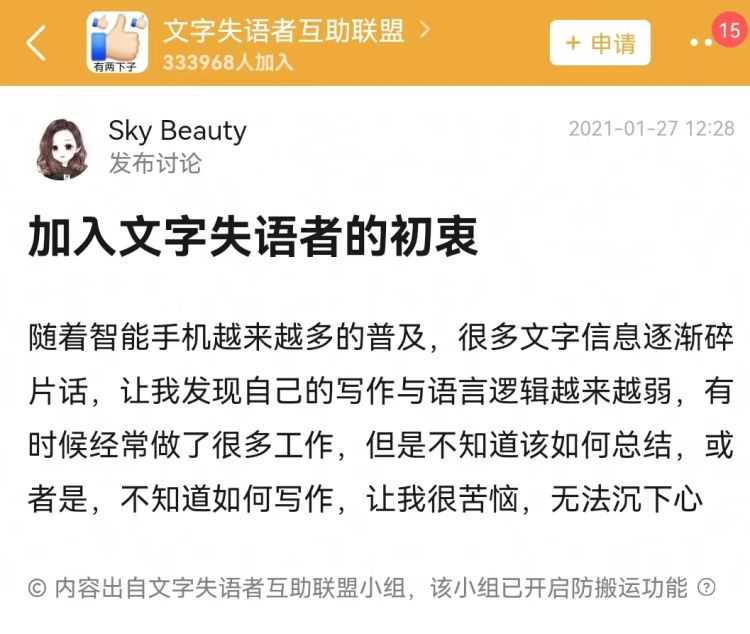 有一部分人已经意识到了自己的文字缺乏症。/豆瓣小组