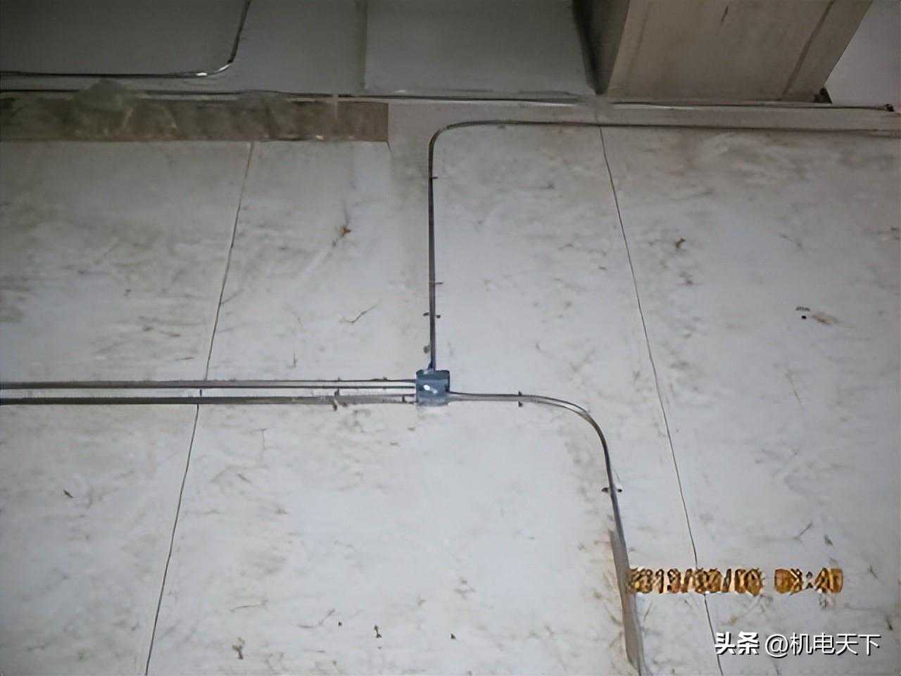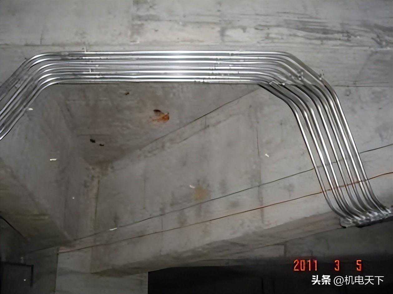 要求:线管沿混凝土顶、梁敷设时,弯曲处不应有褶皱、凹陷、裂纹等缺陷。其弯扁程度,不应大于管外径的10%。线管弯曲半径不应小于管外径的6倍;有两个接线盒间只有一个弯曲时,不应小于管外径的4倍。支吊架最大间距:16-20mm为1.0m;25-32mm为1.5m;40-50mm为2.0m。在吊顶内的线管,当管径为ф16-20mm时,固定间距可增大至1.5m。线管固定点与弯头中点、过线盒、终端盒、箱边缘的间距为150~300mm。