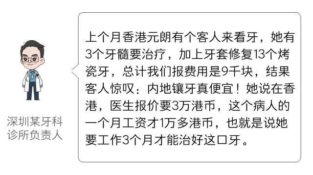 香港的普通老百姓,在那边真是看不起牙。香港公立医院收费便宜,但排期很慢,等个一年半载都是有可能的。私立诊所收费又高,随便一个项目都是深圳的几倍至十几倍(比如说种一颗牙,深圳1万,香港据说要5万),不是工薪阶层能承受。所以真难怪那么多“香港客”要过河看牙。