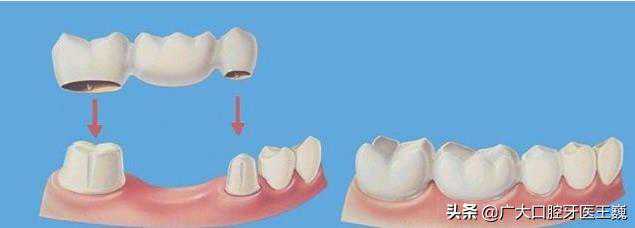 2、相对便宜的固定桥修复,这种不会变形,也耐磨,颜色也稳定不容易变色,就是需要磨除两边的邻牙作为“桥墩”来固定缺失牙部位。