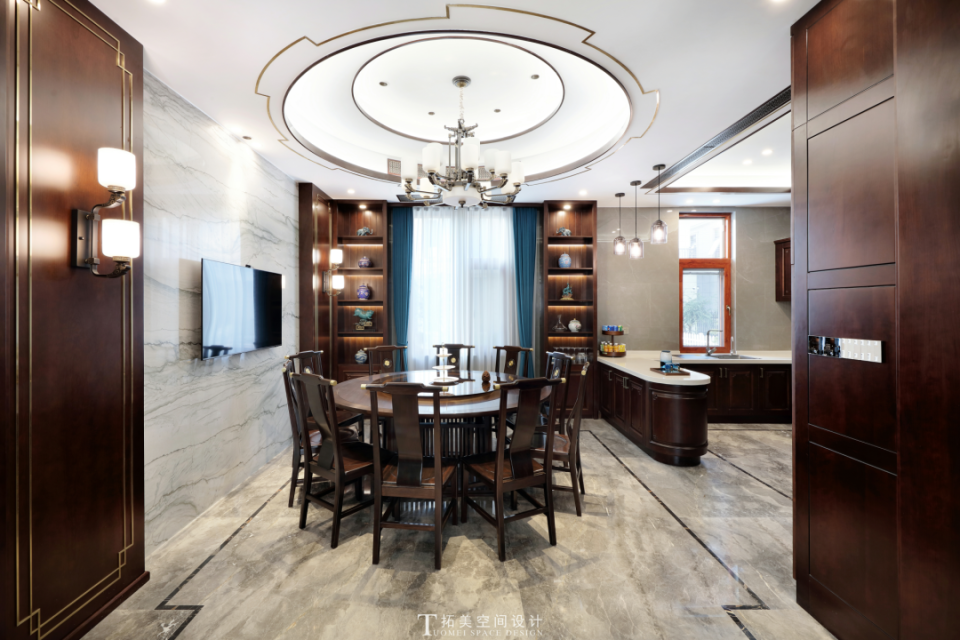 在吊顶灯的照射下,空间更显柔和与纯粹。光,如一汪清泉,流淌在端庄的方椅圆桌之间,弥漫出浪漫的诗意,凝结出东方艺术之美,没有繁杂的装饰,整体氛围更温馨,为居者带来舒适和愉悦的用餐体验。