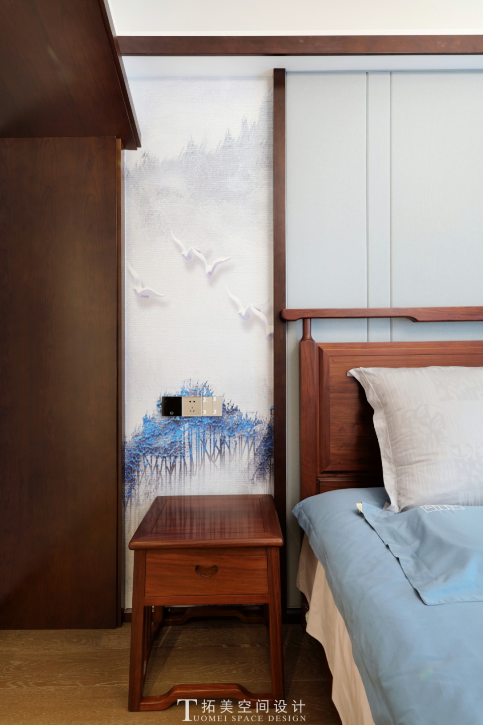 淡雅的山水画铺展在两边床头,山峦起伏之间尽显卧室的柔婉和风雅,将中式之美隐匿于空间的细枝末节之中,择素雅的蓝,让闲适与品味并存。