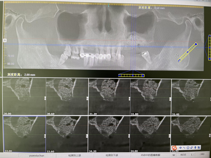 历经两个半小时,于当日17时许,手术圆满结束,术中鼓气试验阴性,术后无明显不适,CBCT显示:24至27区上颌窦底骨高度平均增加约12mm,预计半年后可开始修复,恢复口腔正常咬合功能。