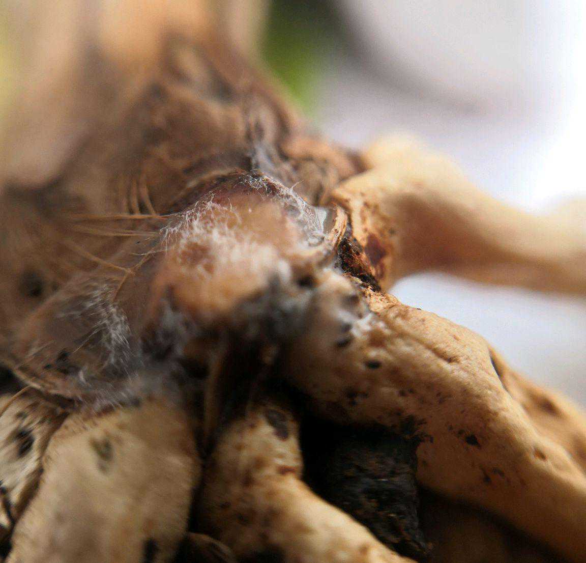 可以很明显地看到,兰花的根部都已经起白色霉层了,主要是伤口位置,我问了网友上盆多久了,网友说上盆一个月,其它的根系还算正常,主要是伤口,说明网友消毒不到位,浇水偏勤而导致的植料湿重烂根,没多大问题,再次修剪消毒,晾根上盆养护就行了。