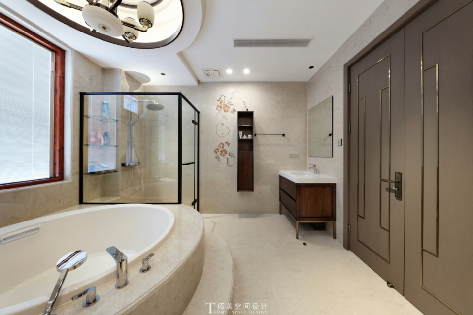 配套卫生间考虑了布局的功能性,将空间的利用率最大化。同时用休闲时尚的色调与层次丰富的顶面设计,突出空间的关怀与温度。简约的格调、写意的线条、清新的色彩,加上块面的现代化表达,营造出自然的诗意与独特的风雅。