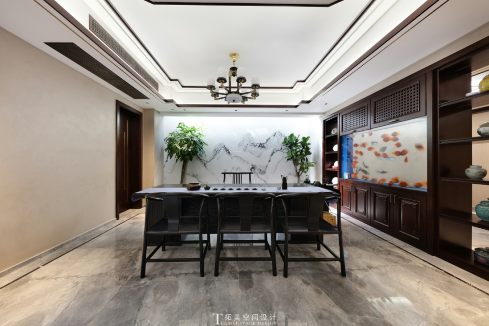 茶室,一处禅意的净土,一处寄托心灵的桃源,红木博古架与古意茶具相辉映,端庄而古朴,衬出东方文化的深厚底蕴,茶桌后是人造叠石水景,山水画石,既有远山的壮丽,又似有云雾的飘逸。