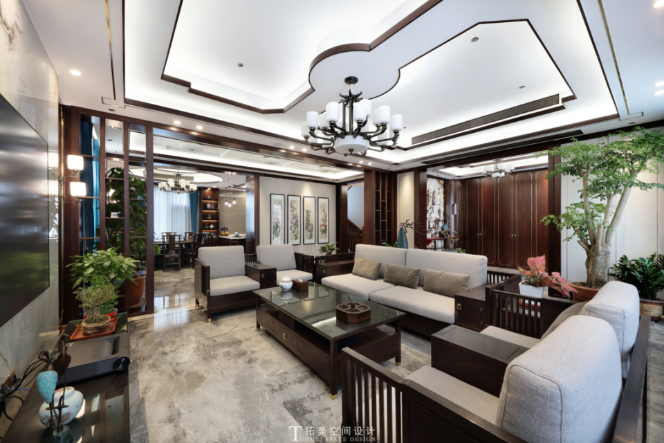 玉石镶嵌的电视背景,凸显了空间温润的质感,每一件家具都在细节处做了仿古设计,处处彰显着古色古香的韵味和深厚的文化底蕴。吊顶的造型曼妙柔美,灯光温柔清雅,沉浸其间,静心休憩,能感知东方韵味赋予生活的典雅和宁静。