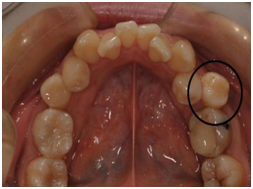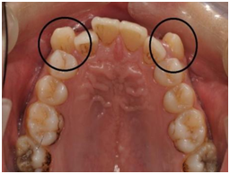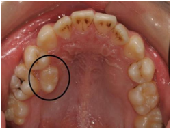 上图圈出来的牙齿就是这位成员了,他们往往是由替牙障碍引起的。乳磨牙过早脱落,新长出的六龄齿没有了前面的阻挡,逐步向前移动,本该在这个位置上长出来的恒牙被迫从其他位置萌出。对这种情况置之不理,则三颗牙齿之间的间隙会发生食物嵌塞,进而形成龋坏,严重的龋坏会造成三颗牙都无法保留。所以,乳牙发生龋坏后要及时治疗,乳磨牙因无法保留而拔除后也应进行积极的间隙管理,为继承的恒牙留出足够的生长空间。