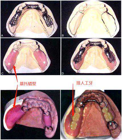 活动义齿的金属支架在铸造打磨完成后,会戴在模型上进行排牙,此时人工牙和支架之间的基托是蜡做的(方便调整人工牙的位置)。