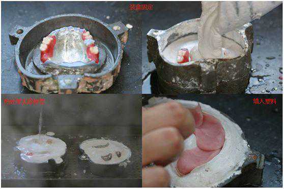 把调拌好的树脂(具有流动性和可塑性)填入去除蜡基托后留下的空腔内,关闭型盒,用压榨器加压,最后把加压固定后的型盒,放入水中进行热处理,使里面的树脂基托材料在一定的压力和温度下,逐渐完成聚合反应。