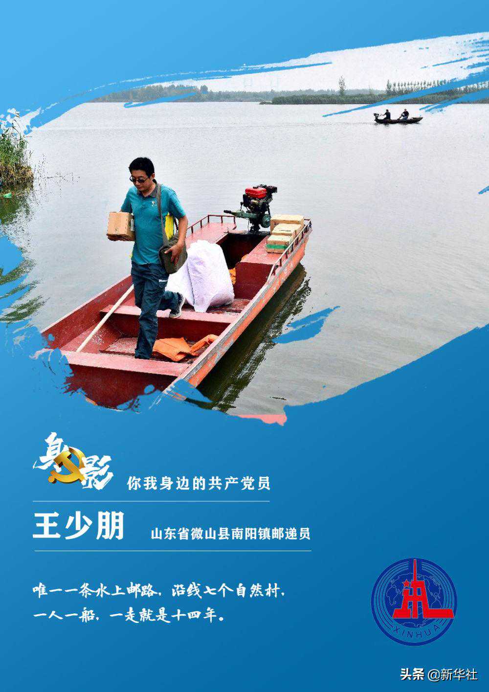 △6月20日,在山东省微山县南阳镇丁楼村,邮递员王少朋将邮船停稳后,带上邮件为村民投递。位于微山湖北端的微山县南阳镇四面环水,交通不便,36岁的共产党员王少朋,自2007年工作以来就一直负责着当地邮政分公司支局唯一一条水上邮路。这条邮路沿线共有7个自然村。一人一船一邮路,王少朋一走就是14年。他进村入户投递报刊、文件、包裹,被村民们亲切地称为“湖上鸿雁”。