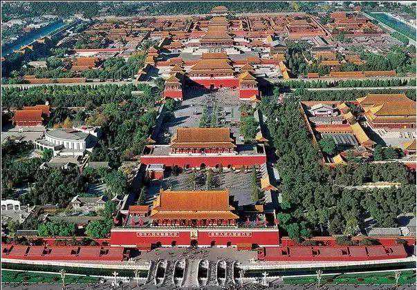 北京故宫于明成祖永乐四年(1406年)开始建设,以南京故宫为蓝本营建,到永乐十八年(1420年)建成。它是一座长方形城池,南北长961米,东西宽753米,四面围有高10米的城墙,城外有宽52米的护城河。紫禁城内的建筑分为外朝和内廷两部分。外朝的中心为太和殿、中和殿、保和殿,统称三大殿,是国家举行大典礼的地方。内廷的中心是乾清宫、交泰殿、坤宁宫,统称后三宫,是皇帝和皇后居住的正宫。