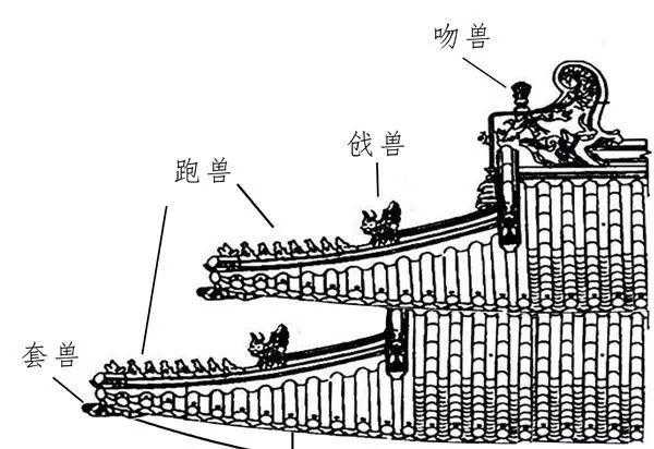 中国古代脊兽是建筑屋脊上所安放的兽件。按类别分为跑兽、垂兽、“仙人”及鸱吻。其中,正脊上安放吻兽或望兽,垂脊上安放垂兽,戗脊上安放戗兽,另在屋脊边缘处安放仙人走兽。