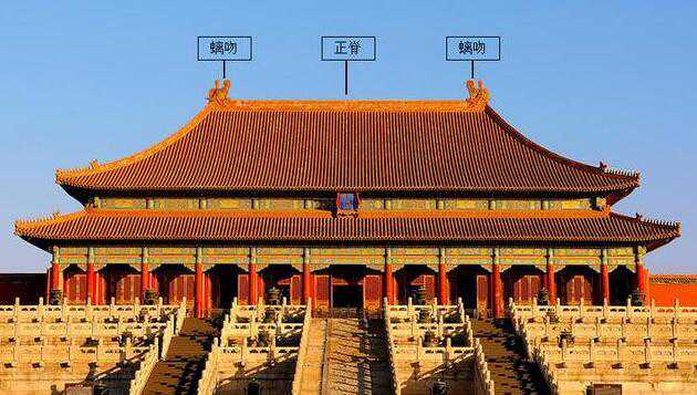 鸱吻:(音吃吻,龙的九子之一),最喜欢四处眺望,常饰于正脊上,它形似鱼尾,张牙舞爪,似乎要吞下整个屋脊,故又名"吞脊兽"。传说这种正吻是海龙王的九子之一,它属水,能激浪成雨,把它放在屋脊上可以当作灭火消灾的"镇物";但又怕它吞下整条屋脊,故用宝剑将它牢牢扎住。中国最大的“大吻”在太和殿的殿顶上。它由13块琉璃件构成,总高3.4米,重4.3吨,是中国明清时代的宫殿龙饰物——“正吻”的典型作品。