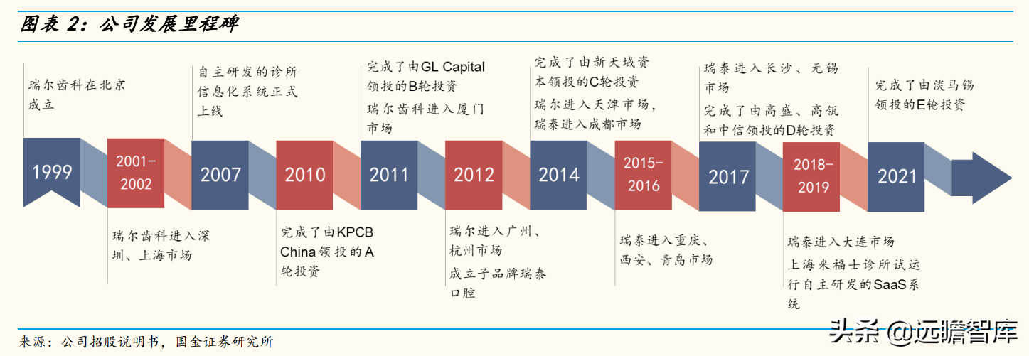 1999年4月,瑞尔齿科创始人邹其芳先生创建了北京第一家国内高端口腔诊所,定位高端人群。2012年,公司推出第二品牌瑞泰口腔,服务于国内的中端人群,公司也从前1999年-2010年的学习积累期,进入了2012年至今的快速发展期。