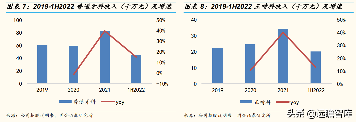 2021年普通牙科与正畸科收入增速均超过平均增速。2021年公司普通牙科收入达到8.28亿元,同比增长39.50%,2019至2021年CAGR为17.15%。2021年公司正畸科收入达到3.42亿元,同比增长39.72%,2019至2021年CAGR为24.05%。