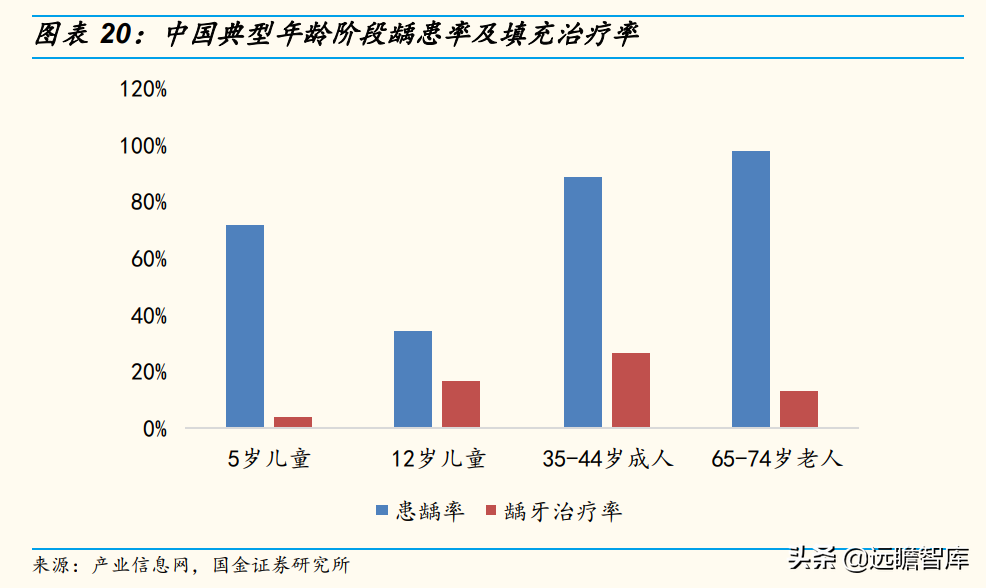 国内口腔疾病诊疗率低,发展潜力大。以龋齿为例,根据口腔流行病学调查结果,5岁儿童、12岁儿童、35~44岁成人、65~74岁老年人四个年龄阶段龋齿填充治疗率仅为4.1%、16.5%、26.6%、12.8%,远低于对应阶段龋患率。