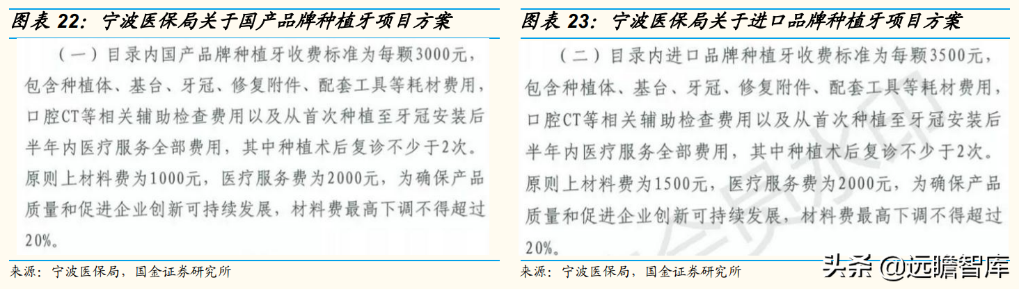 宁波种植牙纳入医保历年账户的《方案》提出,国产每颗3000元,包含种植体、基台、牙冠、修复附件、配套工具等耗材费用,以后续半年内医疗服务全部费用。原则上材料费1000元,医疗服务费用2000元。材料费最高下调不超过20%。进口品牌牙收费标准3500元,包含种植体、基台、牙冠、修复附件、配套工具等耗材费用,以后续半年内医疗服务全部费用。原则上材料费1500元,医疗服务费2000元。材料费最高下调不超过20%。