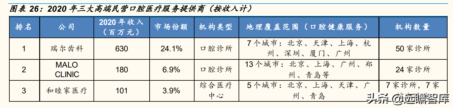 公司是高端民营口腔医疗服务提供商的领军者。按2020年收入计,公司占高端民营口腔医疗服务市场的24.1%。