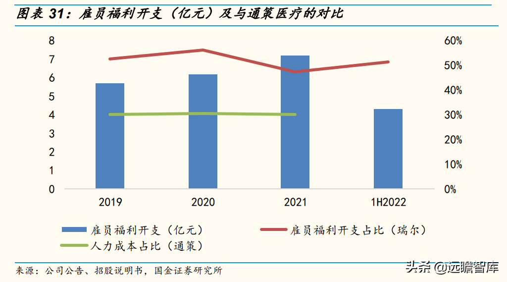 人力成本占比较高。2021年公司雇员福利开支共7.17亿元,营收占比为47.27%。2019年及2020年雇员福利开支占比分别为52.43%、55.90%,均高于同时期通策医疗人力成本占比水平。