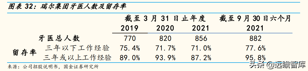 留存率较高。与公司雇佣关系超过五年、十年以及十五年的牙医占医生总数的31.9%、11.2%和4.8%。