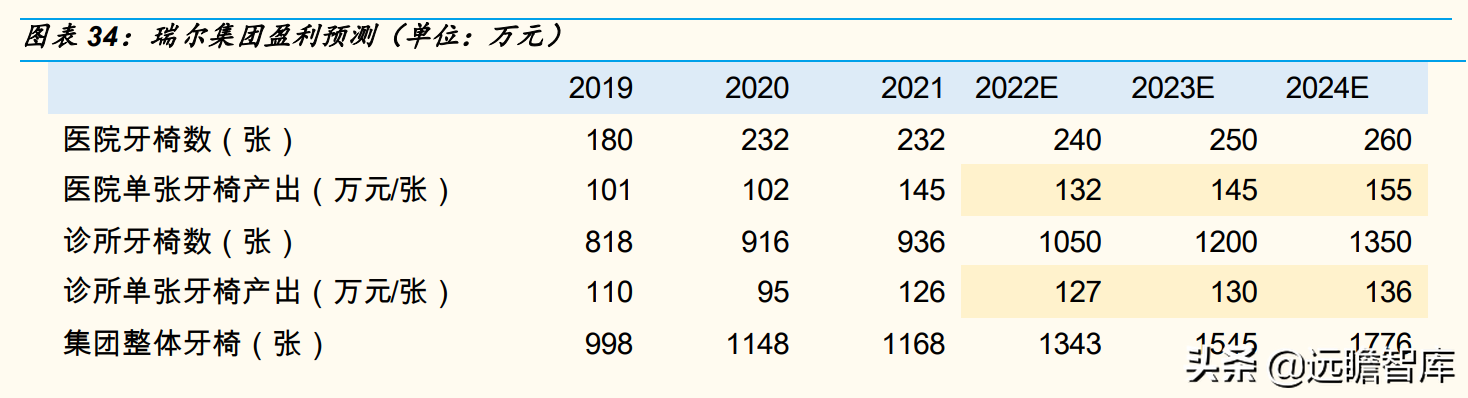 牙椅的数量增长,一方面来自医院牙椅数量的增长,另一方面为诊所的牙椅数量的增长,我们认为由于目前公司医院数量为7家,诊所数量为104家,我们认为2022-2024年公司在医院与诊所的建设数量上有望延续前期诊所数量增会较快的趋势,因此预计2022-2024年牙椅数量的增长以诊所数量的增长贡献为主,医院数量的增长带来牙椅数量的增长为辅,预计2022-2024年诊所的牙椅数量分别增加114张、150张、150张,不考虑外延并购,预计医院牙椅数量分别增长8张、10张、10张。