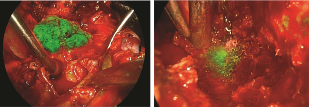 目前已有研究团队将术中荧光引导技术应用于骨与软组织肿瘤领域。Wang[10]在手术期间对34例骨和软组织肿瘤患者进行了吲哚菁绿(ICG)荧光成像,在手术前一天的60分钟内以2mg/kg的剂量静脉注入ICG。随后分析每个肿瘤的染色率,并在肿瘤切除后,对有荧光残留的部位进行活检。总体肿瘤染色率为88%,骨肉瘤特异性染色率为90%,骨巨细胞瘤特异性染色率为92%。对于恶性肿瘤,总染色率为94%,而对于良性肿瘤,染色率为82%。结果证明这种成像技术在识别残留肿瘤组织方面具有潜在临床应用价值。