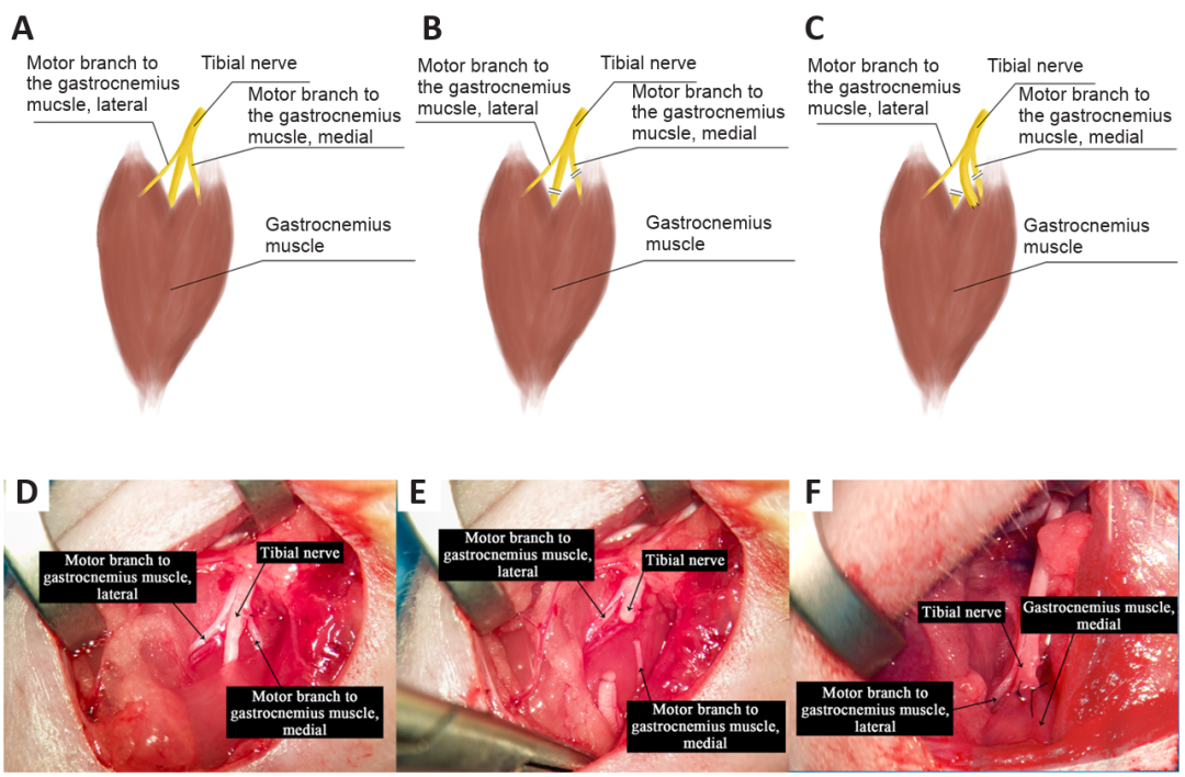 图7左后肢TNT和TMR大鼠模型。(A)正常组、(B)TNT组和(C)TMR组;(D)显露胫神经及其分支,(E)切断胫神经和腓肠肌内侧头的运动分支,(F)将被切断的胫神经近端缝合到腓肠肌内侧。TMR:靶向肌肉重神经,TNT:胫神经切断。[48]