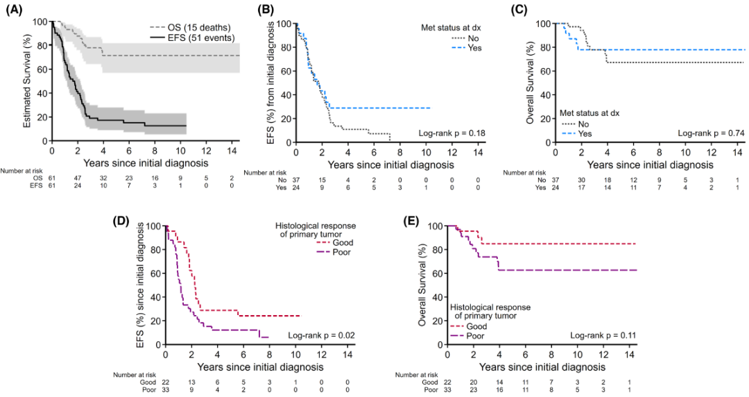 骨肉瘤是最常见的原发恶性骨肿瘤,约20%患者为转移性骨肉瘤,孤立性肺转移患者5年无事件生存率(EFS)40%;多发性肺转移或其他部位放射学可检测到的转移性疾病的患者,5年EFS20%[50]。Kuo[51]纳入61例在初次治疗期间或首次复发时接受骨肉瘤肺转移切除术(PM)患者评估了包括开胸手术、胸腔镜手术、胸腔镜联合开胸手术(胸腔镜为首选方法,后续转为开胸手术)在内的手术方式对患者生存率的影响。结果显示,在初次治疗中,所有技术的气胸发生率相当,但在首次复发行PM时,胸腔镜手术组的发生率显著降低。开胸手术组和胸腔镜联合开胸手术组在初次治疗和首次复发治疗中疼痛更严重,作者推测可能是由于反复开胸或先前瘢痕形成引起的广泛组织损伤导致神经性疼痛增加。