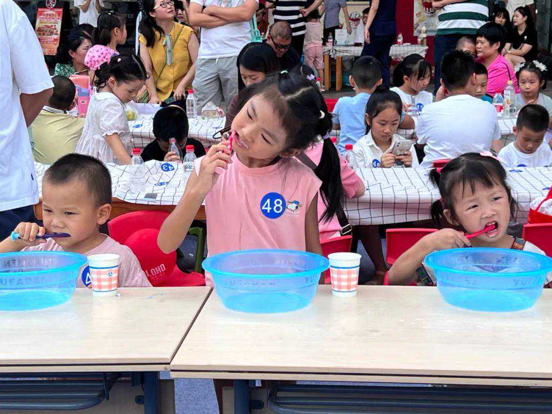 一个小盆、一把牙刷,随着主持人一声令下,护牙小卫士们正式比拼开始了:他们熟练地挤牙膏,从容地刷着牙,胸有成竹,不紧不慢,上下左右,不放过每一颗牙齿。