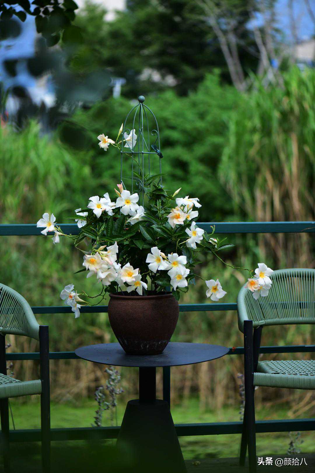 河边的水汽充足,下午4点后就没有西晒太阳了,每天傍晚浇透水,花盆小,第二天又全部干透。这些应该都是这盆飘香藤不断开花的相关因素。