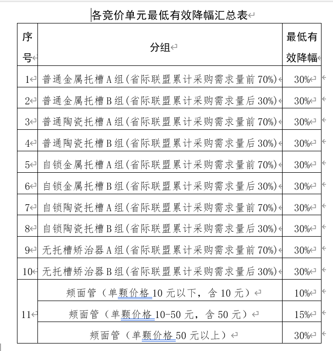 公告要求,联盟省(区、兵团)开展口腔牙齿正畸的公立医疗机构(含军队医院)(以下简称“医疗机构”)均应参加,医保定点社会办医疗机构自愿参加。各产品的采购需求量按参与本次带量采购的每一家医疗机构报送各产品采购需求量累加得出。医疗机构报送的采购需求量原则上不得低于上一年度实际使用量的70%。颊面管产品不参与报量。