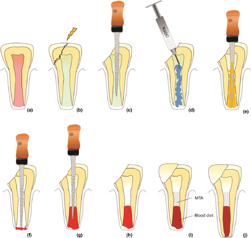 为了让治疗后的牙齿可以继续发育,人们发明了一种名叫“牙髓血运重建术”的治疗方法,这个治疗方法是通过对感染坏死的年轻恒牙联合用药进行彻底的消毒,然后刺激牙齿根尖周组织出血,待根尖下方周围组织形成血凝块后用材料严密封闭牙齿上方,促进年轻恒牙的牙根管腔内新生组织再生。新生组织有助于牙根长度的增加、管壁的增厚和根尖孔的闭合,从而达到接近正常牙根发育的效果。