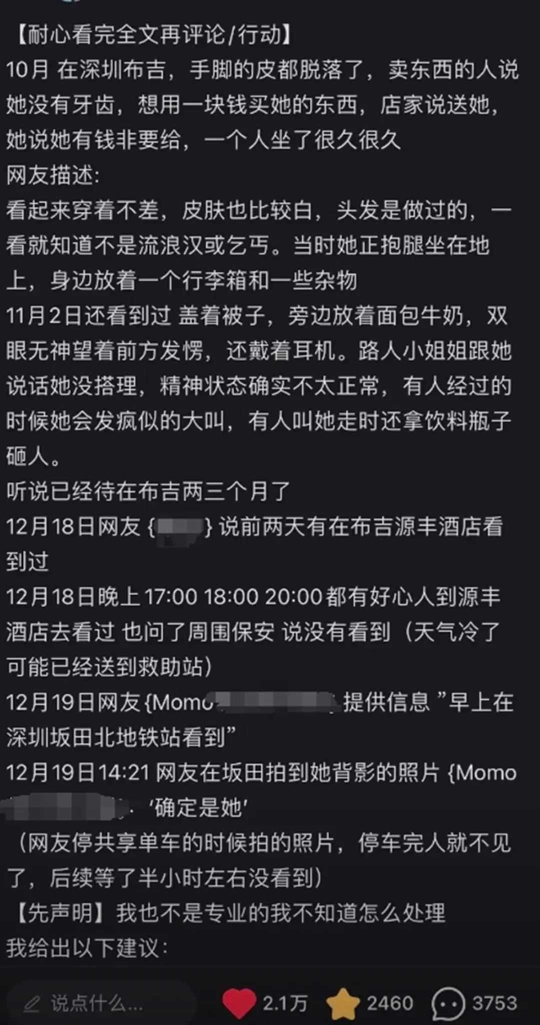 据极目新闻此前报道,网友发布的帖文显示,该流浪女子手脚起皮、牙齿脱落坐在街头,身边放着一个行李箱和一些杂物。该女子精神疑似不正常,有时会大喊大叫。有网友表示,早在今年10月已经有人看到该女子在布吉街道流浪,此外,还有网友在坂田街道看到过她的身影。