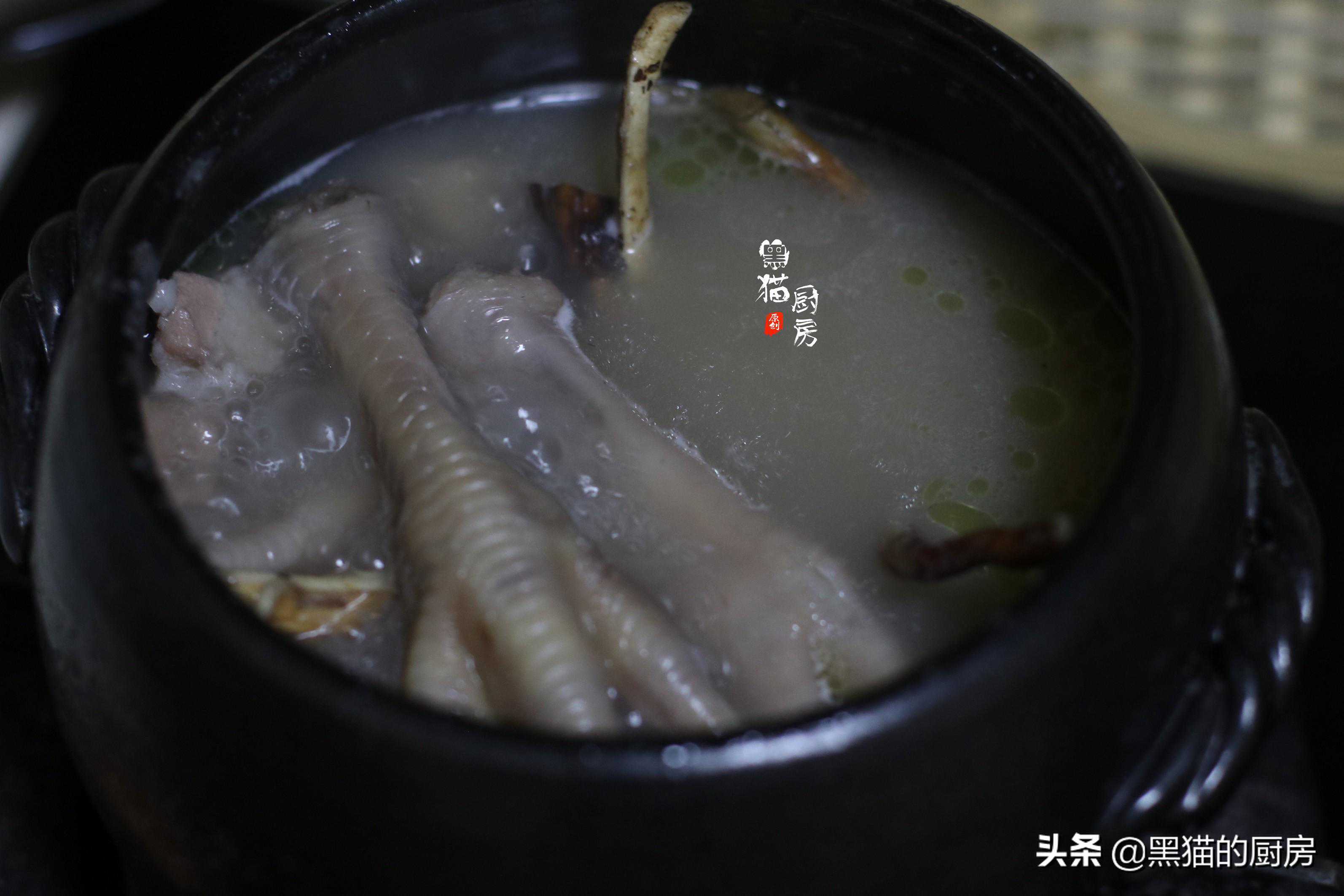 5.小火煲40分钟左右,放了眉豆和鸡脚搭配煲汤,汤色微微奶白,是因为眉豆有淀粉,眉豆煮熟软透后,淀粉释出,使五指毛桃汤更浓香好喝,营养更丰富。