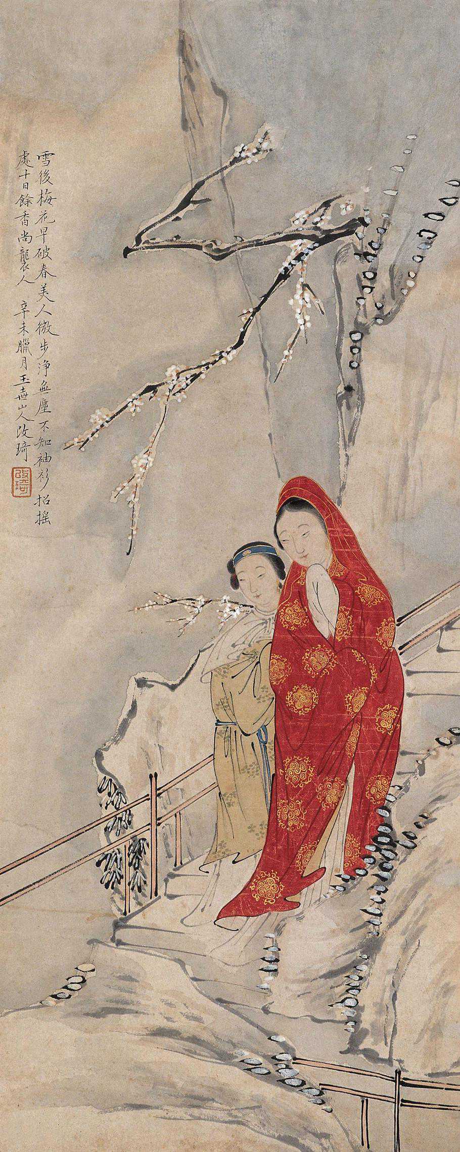 影梅庵是冒襄的书斋名,这样的名字几乎也契合明清大量女性绘画的主题。在清代画家改琦1823年所作的一幅梅花仕女图里,梅树下一位美人侧身站立,双手持着梅枝,画面中似乎梅花绽放,寒香扑鼻,那位美人被梅香吸引,似乎勾起满腹心思,面露惆怅,望着地面陷入遐想。而在另一幅《探雪寻梅图》里,两位仕女踏雪寻梅、折得梅枝,清香高洁的气息似乎可以跃出纸面。同样,作为现实与绘画的彼此映射,冒襄在如皋的房屋和亭子前种满了梅花,春天时早晚出入,仿佛身处烂漫的香雪里。梅花含苞待放时,董小宛就已看好梅枝的姿态,和几案上的瓶罐相配合,或者在前一年即将枝条修剪得适合插瓶,待花开时刚好采摘回来插放在几案上。这些生活化的琐碎细节,我们不可能一一在女性主题绘画里见到,却可以在绘画之外的留白处看出端倪,因为画中女性的私人生活空间,经常可以折射出她们优雅的现实生活状态,无论那些真实发生过的,抑或只是画家从美学生活角度希望它们正在发生的那样。