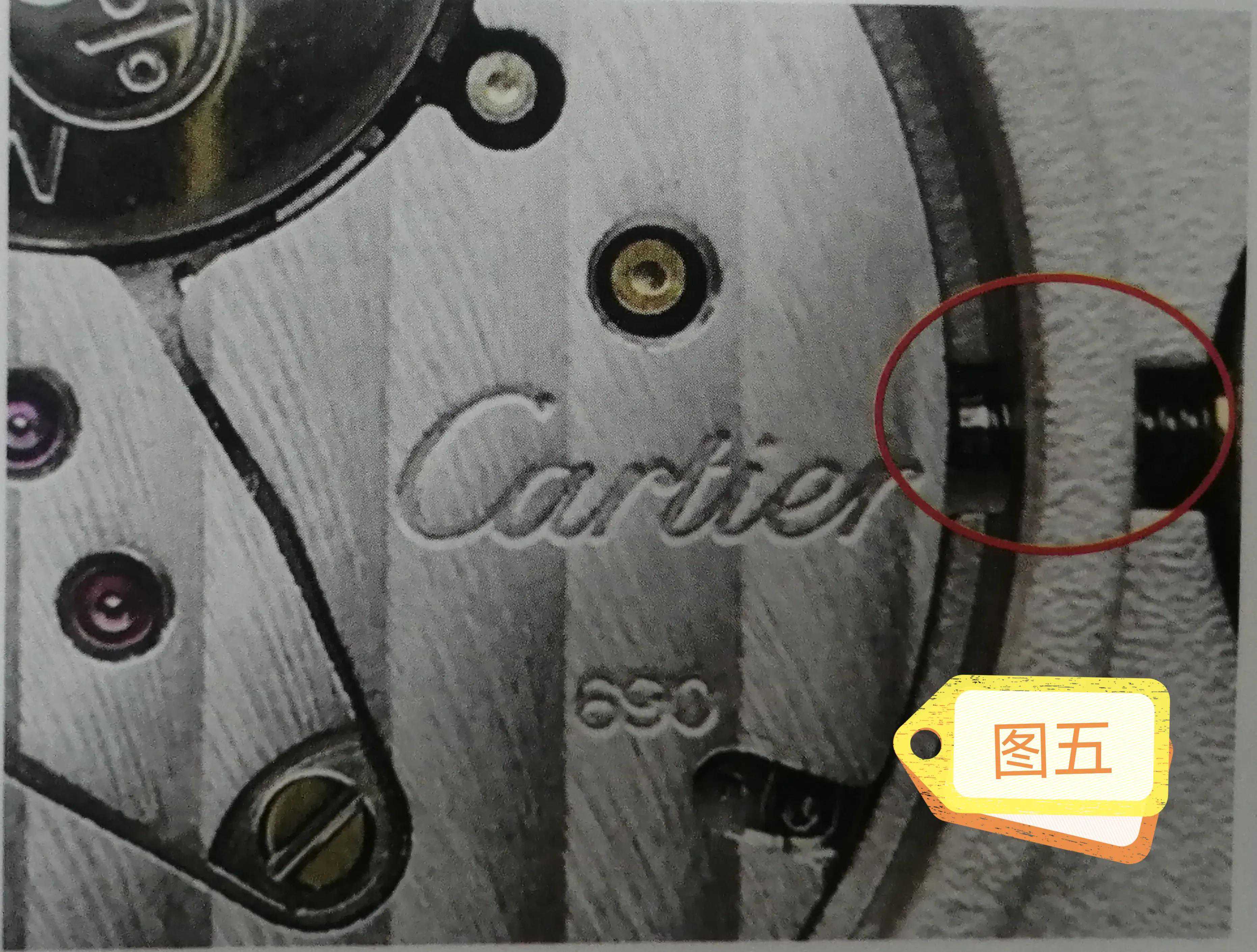 注意:卡地亚表冠放大观察出现明显螺纹为仿表特征,但部分高端仿品已经注意到这一特征,例如图五图六都为真芯假壳仿品,但图五表冠处有套管,所以遇到表冠处有螺纹的仿品,这一通用鉴定点适用,例如图六,但不能作为真伪判定点,即便表冠处有套管也不能证明表为正品,需要综合判定。手表鉴#