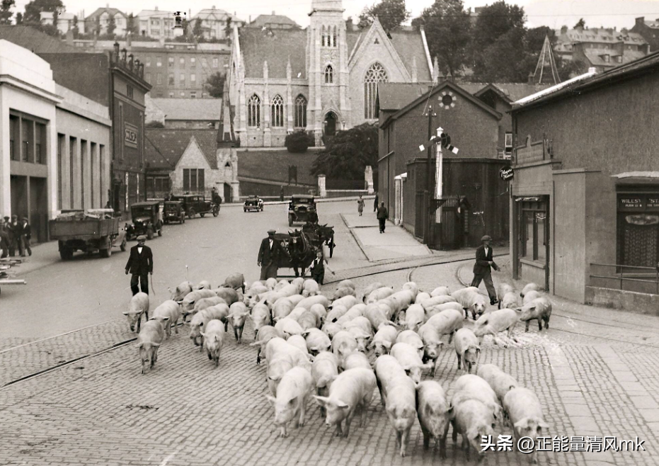 在爱尔兰科克的布赖恩·博鲁街,三位男人和一位小孩儿,正站在一群猪的身后,他们要把这群赶回家。宽阔的街道上能看到汽车,成群结队的猪在大路上埋头往前跑,前边不远处就是布赖恩·博鲁桥,桥对岸的不远处,就是他们的目的地。