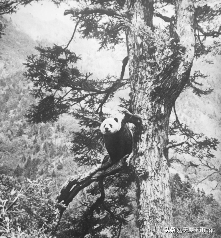 1969年,中国科学院动物研究所的工作人员,在前往川北的森林中,开展考察任务的时候,在林子的一棵大树上,发现了一只大熊猫。它正惬意地坐在树干上,似乎正在眺望着远方。工作人员远远地望着大熊猫,用相机拍下了这张照片。