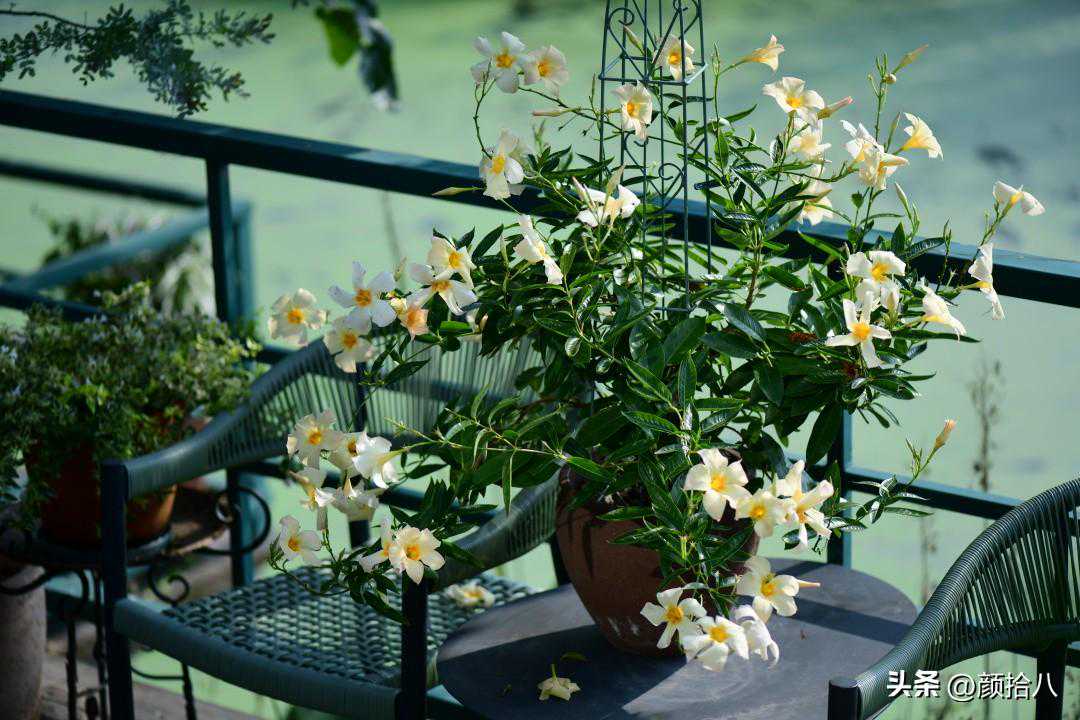 河边的水汽充足,下午4点后就没有西晒太阳了,每天傍晚浇透水,花盆小,第二天又全部干透。这些应该都是这盆飘香藤不断开花的相关因素。