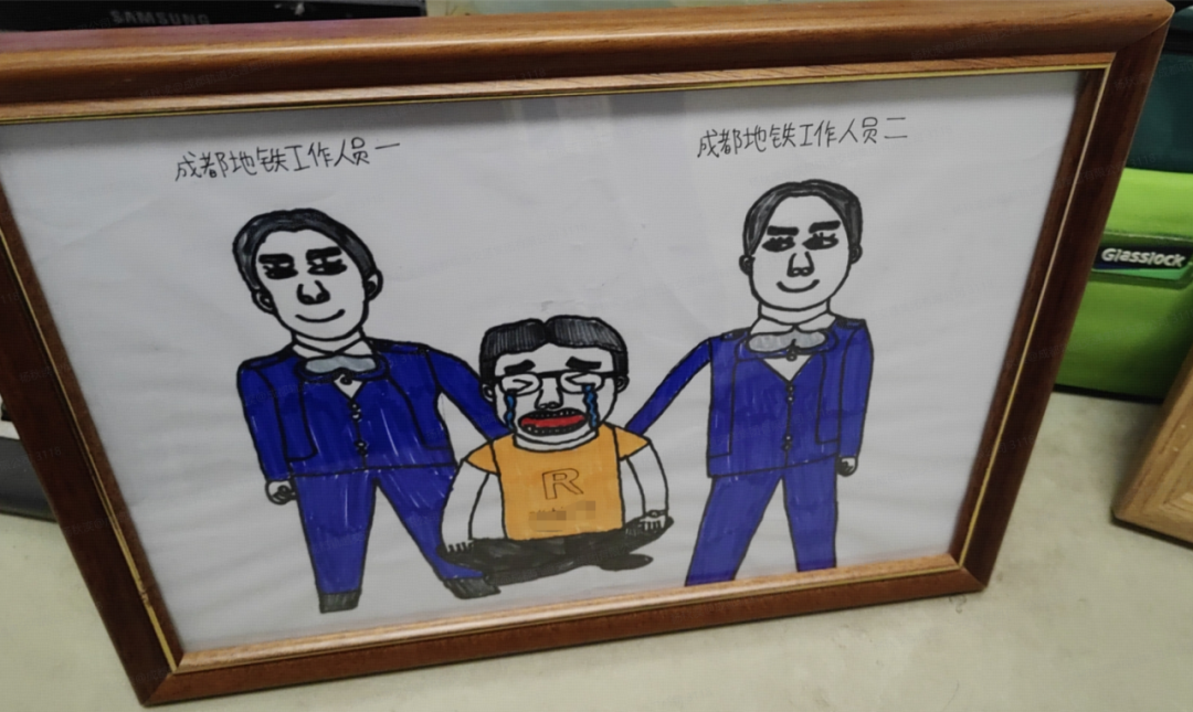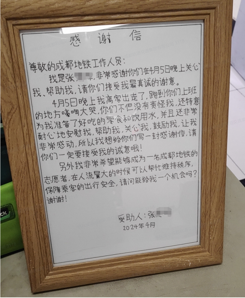 相框里是一封字迹工整的感谢信,和一副精心绘制的漫画。在感谢信的末尾,乘客写道:“我非常希望能够成为一名成都地铁的志愿者,在客流量大的时候可以帮忙维持秩序!”