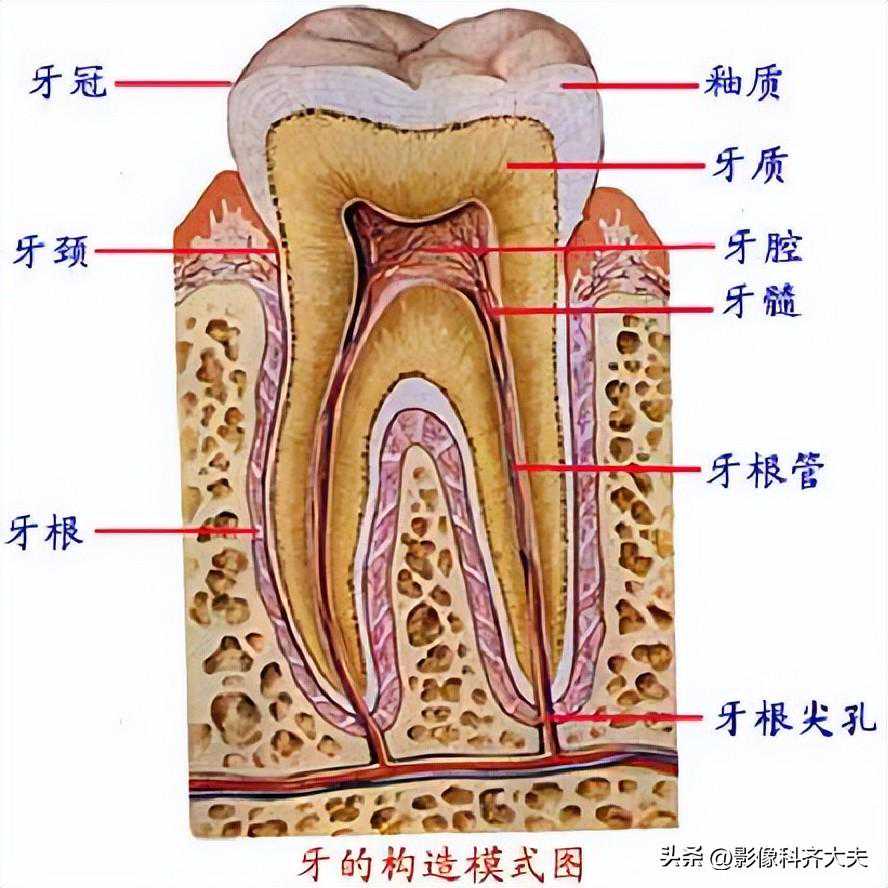 牙的构造包括牙质、牙釉质、粘合质。牙质为主体,牙釉质覆盖于牙冠表面,粘合质也称牙骨质,包在牙根、牙颈周围。