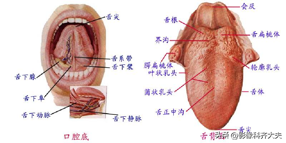 舌位于口腔底,以“V”形界沟分为舌前2/3的舌体和舌后1/3的舌根。舌的构造主要包括舌粘膜