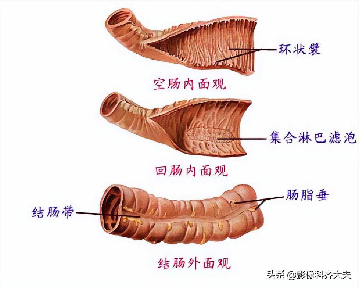(1)空肠:腹腔左上部,空回肠前2/5,管径较大,管壁较厚,血供丰富。