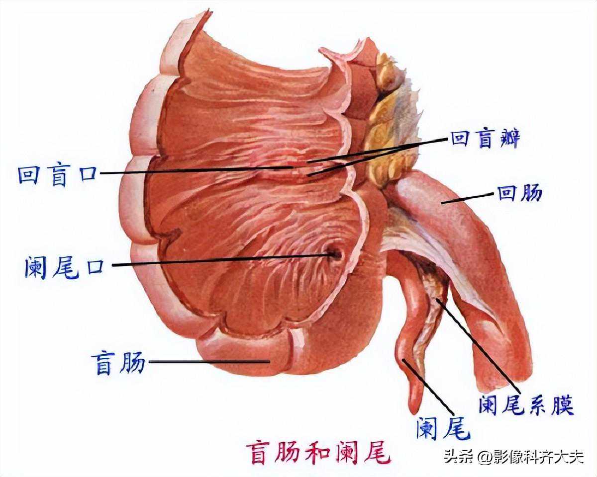 大肠起自回肠,终于肛门。约1.5米,呈“门框”状包绕在小肠周围。分为盲肠、结肠、直肠三部。盲肠和结肠表面有三个特征性的结构,即:结肠带、结肠袋、肠脂垂。结肠带共三条,交汇于阑尾根部。