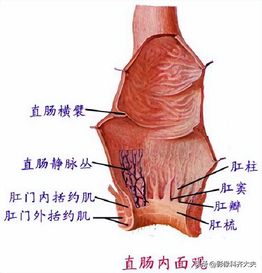 上接乙状结肠,下接肛门,约15cm。全长有两个弯曲,骶曲凸向后,会阴曲凸向前。以盆膈为界分为盆部和肛门部。
